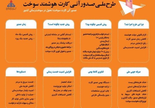 🔹در این طرح، صدور آنی کارت سوخت با ثبتنام و مراجعه غیرحضوری به سامانه fcs.niopdc.ir بهصورت کاملاً الکترونیکی انجام میشود و با استفاده از این سامانه ترددهای لازم برای مراجعه و پیگیریهای لازم برای صدرور کارت سوخت از طریق فرآیند قبلی کاهش مییابد.