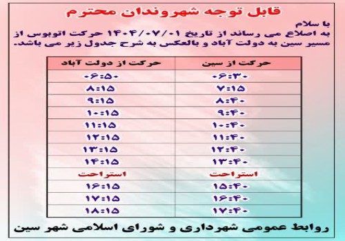 ساعت سرویس اتوبوس شهر سین به دولت آباد و بالعکس ویژه سال تحصیلی و از اول مهر